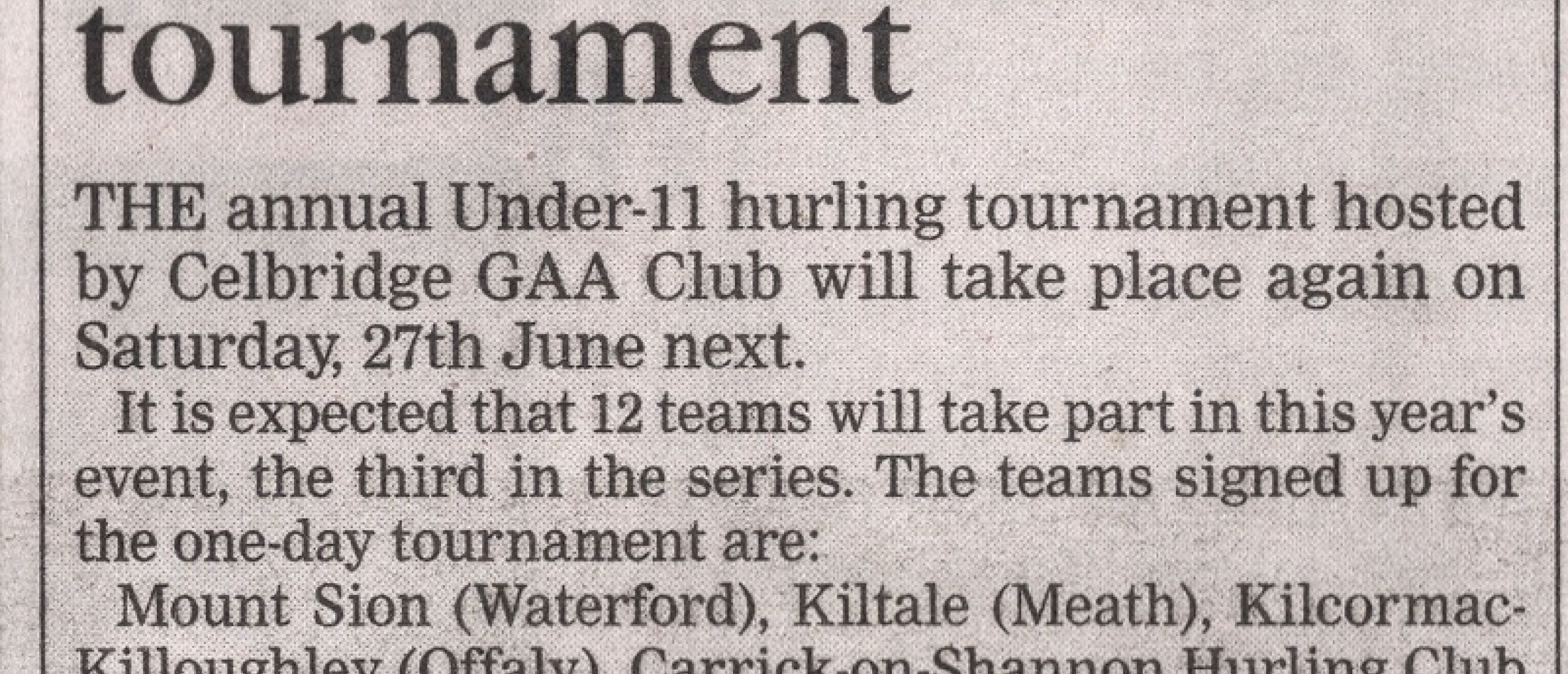 The annual Celbridge GAA CLUB U-11 Hurling Tournament is fixed for Sat 27th June.