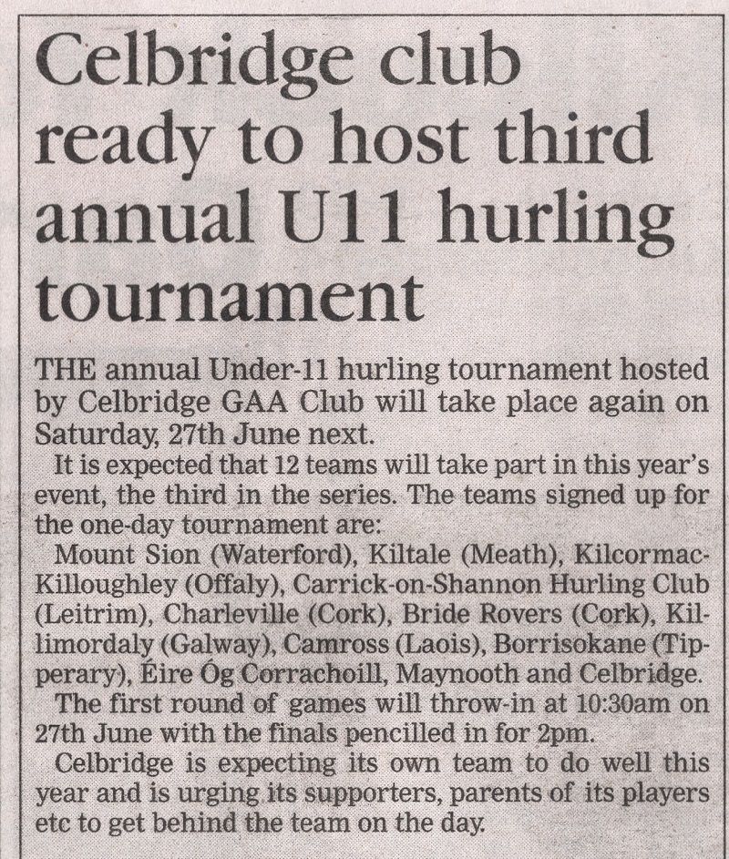 The annual Celbridge GAA CLUB U-11 Hurling Tournament is fixed for Sat 27th June.