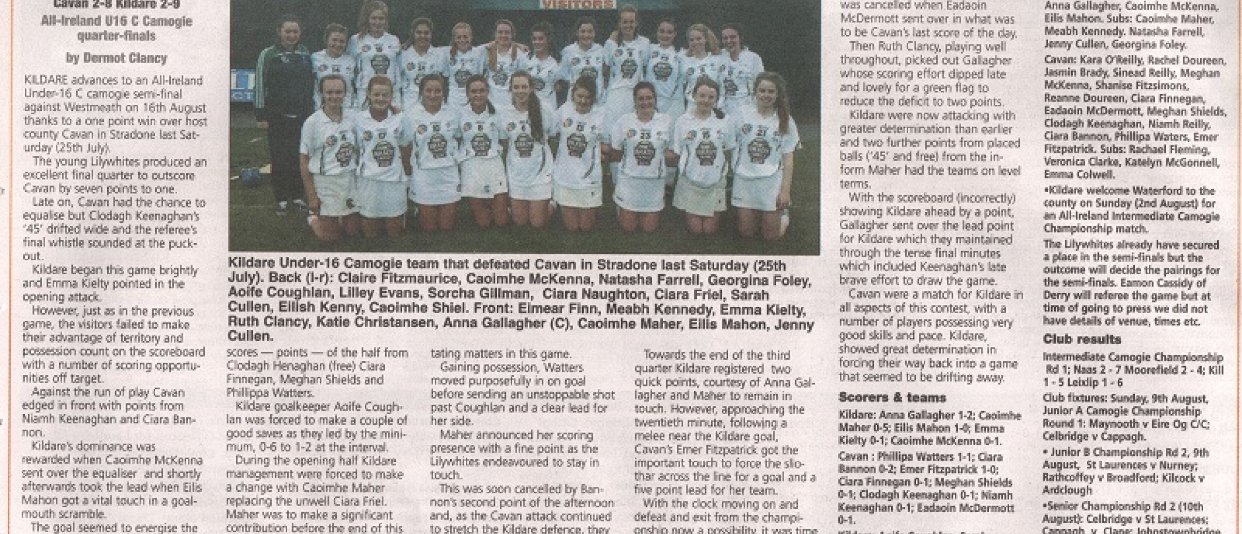 Kildare : Aoife Coughlan, Sarah Cullen, Ciara Naughton, Lilley Evans, Eilis Kenny, Kate Christansen, Eimear Finn, Ruth Clancy, Ciara Friel, Emma Kielty, Caoimhe Sheil, Sorcha Gillman, Anna Gallagher, Caoimhe McKenna, Eilis Mahon. Subs used : Caoimhe Maher, Meabh Kennedy. Natasha Farrell, Jenny Cullen, Georgina Foley.